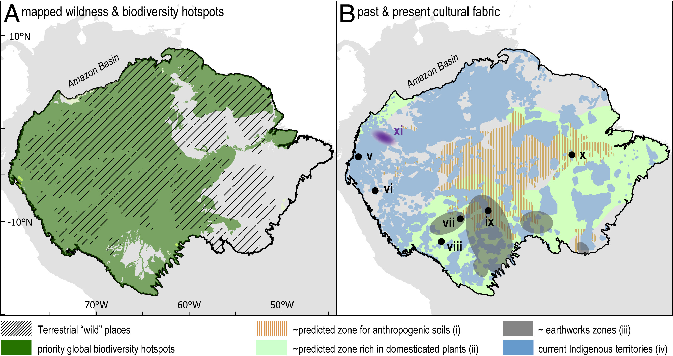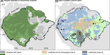 Figura 1.Zonas de la cuenca amazónica supuestamente prístinas y salvajes hoy en día. El estudio de los suelos (derecha) muestra claramente que la mayor parte de estas zonas son el producto de la gestión humana, en ocasiones bastante intensiva.