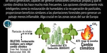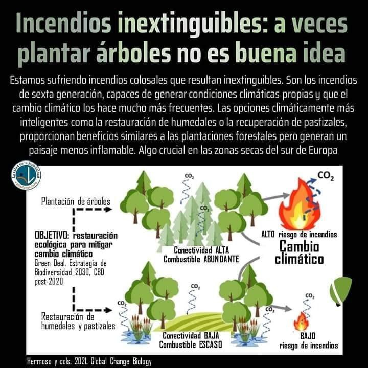 Figura 2. Las plantaciones masivas de árboles pueden ser contraproducentes en muchas zonas del planeta. Hay que efectuarlas con criterio y mesura… Las cubiertas forestales homogéneas y tupidas favorecen la propagación de los incendios, bien sean plantadas o recrecidas espontáneamente, por ejemplo, por matorralización de un territorio que se abandona. La formación de áreasde pasto o humedal que interrumpan la conexión entre zonas espesas disminuye la propagación del fuego, amén de disparar la biodiversidad (en la variedad está el gusto).